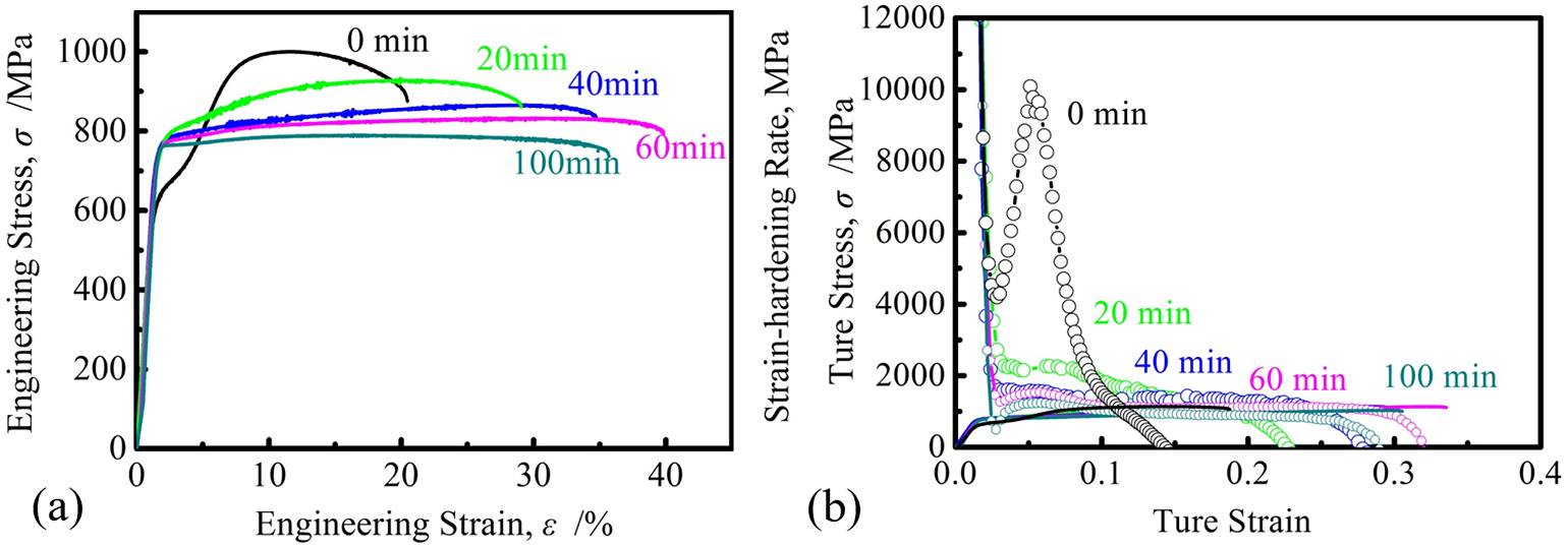 图2. Ti-5321合金固溶后水淬在200℃保温不同时间后的拉伸性能