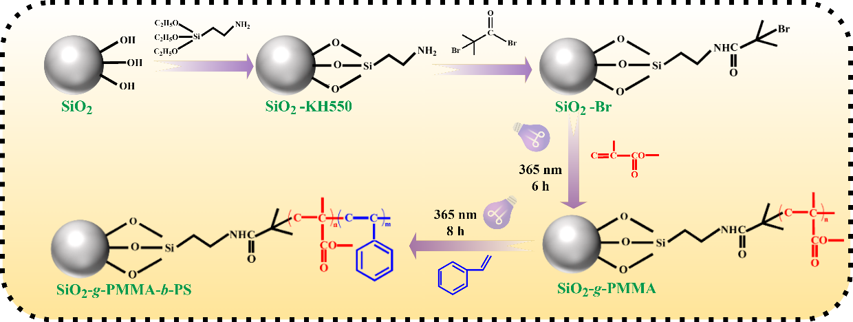 原子转移自由基聚合(ATRP)是“主链接枝法(grafting from)”的实现方式之一,是活性可控自由基聚合的一种。ATRP在制备表面改性杂化材料方面的一个优势是,通过使用商业上可直接获得的或容易合成的α-卤代酯或苄基卤代物将功能性ATRP引发剂成功地固定在平面、凹、或凸表面上,然后加入各种类型的单体将靶向底物功能化。另一个优势是,ATRP体系适用于多数单体,反应条件温和,对单体功能性基团和杂质具有耐受性,可以在底物上合成具有可控分子量,分子量分布窄的嵌段、星型、梳状、梯度和超支化的聚合物链。传统的ATRP以低价过渡金属卤化物为催化剂,使得反应需要在无水无氧的严苛环境下进行,而且过渡金属离子的存在会使产品老化变色,限制了产品在许多领域的应用。无金属ATRP由于彻底摆脱了过渡金属离子的干扰、光源容易获得、副反应少、聚合过程时空可控等优点,引起了研究者的广泛关注。