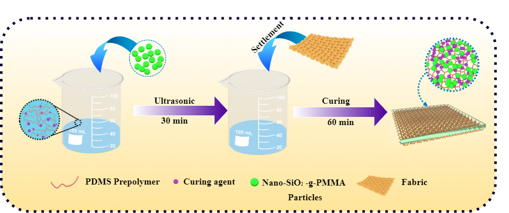该课题组采用无金属ATRP法制备了SiO2- g -PMMA杂化材料,并将其以层的形式固化在织物表面。系统地比较了几种不同类型的典型光催化剂在制备SiO2- g -PMMA杂化材料中的催化机理和效果并探讨了SiO2- g -PMMA改性层的疏水亲油效果。首先用偶联剂处理纳米SiO2颗粒表面的大量羟基,然后将小分子引发剂与偶联剂修饰的纳米SiO2结合,形成大分子引发剂。大分子引发剂引发甲基丙烯酸甲酯(MMA)形成接枝密度高、分子量可设计、分子量分布窄的SiO2- g -PMMA纳米杂化材料。最后,将SiO2- g -PMMA纳米杂化颗粒以层的形式固化在织物表面,改性层表现出优异的超疏水性,在自清洁和油水分离方面展现出了良好的应用前景。