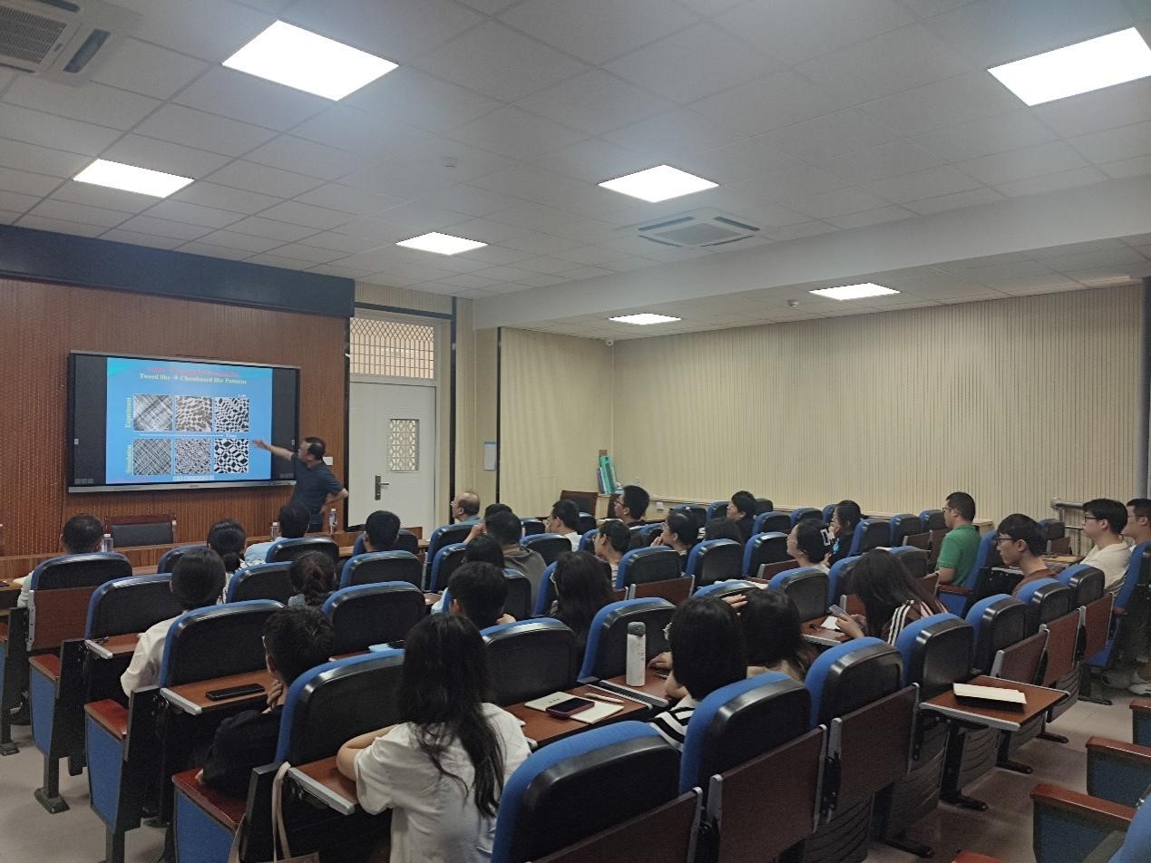 饶伟锋教授首先介绍了相场模型与模拟的研究背景和基本原理,并且举例说明了相场模型在探索微结构演化研究中的重要应用,直观展示了材料介观微结构的模拟演化过程。接着,分别以引入缺陷的橡胶金属和铁电准同型相界(MPB)为例,重点阐述了含缺陷预转变材料中的超弹响应以及通过组织结构优化铁电材料性能方案。最后,介绍了近期相场模拟和实验结合研究材料催化性能及生物医用镁合金的的工作。整场学术报告精彩纷呈、内容丰富,使我院师生对缺陷调控和相场模拟有了更加深刻的认识,拓宽了学术视野,为广大师生以后的科研工作提供了新的研究思路。