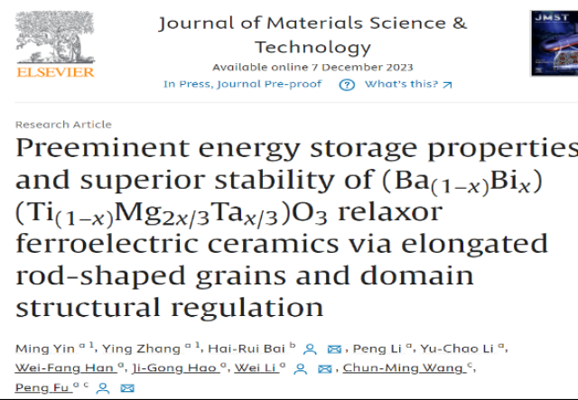 近日,公司付鹏副教授、李伟教授和山东大学王春明教授在Bi0.5Na0.5TiO3(BNT)和BaTiO3(BT)基储能陶瓷研究中取得新进展。通过组分、晶粒形状及尺寸调控等策略,增强了BNT基和BT基陶瓷弛豫性能,实现了其综合储能性能的提高。相关研究成果以“Enhanced energy storage properties and good stability of novel (1- x )Na0.5Bi0.5TiO3- x Ca(Mg1/3Nb2/3)O3 relaxor ferroelectric ceramics prepared by chemical modification”和“Preeminent energy storage properties and superior stability of (Ba(1- x )Bi x )(Ti(1- x ))Mg2 x /3Ta x /3)O3 relaxor ferroelectric ceramics via elongated rod-shaped grains and domain structural regulation”为题先后在线发表在 Journal of Materiomics (简称:JMAT,中科院1区,2022年发布的IF达到9.4)和 Journal of Materials Science &Technology (简称:JMST,中科院1区,2022年发布的IF达到10.9)期刊上。论文链接分别为:https://doi.org/10.1016/j.jmat.2023.09.009、https://doi.org/10.1016/j.jmst.2023.10.036。