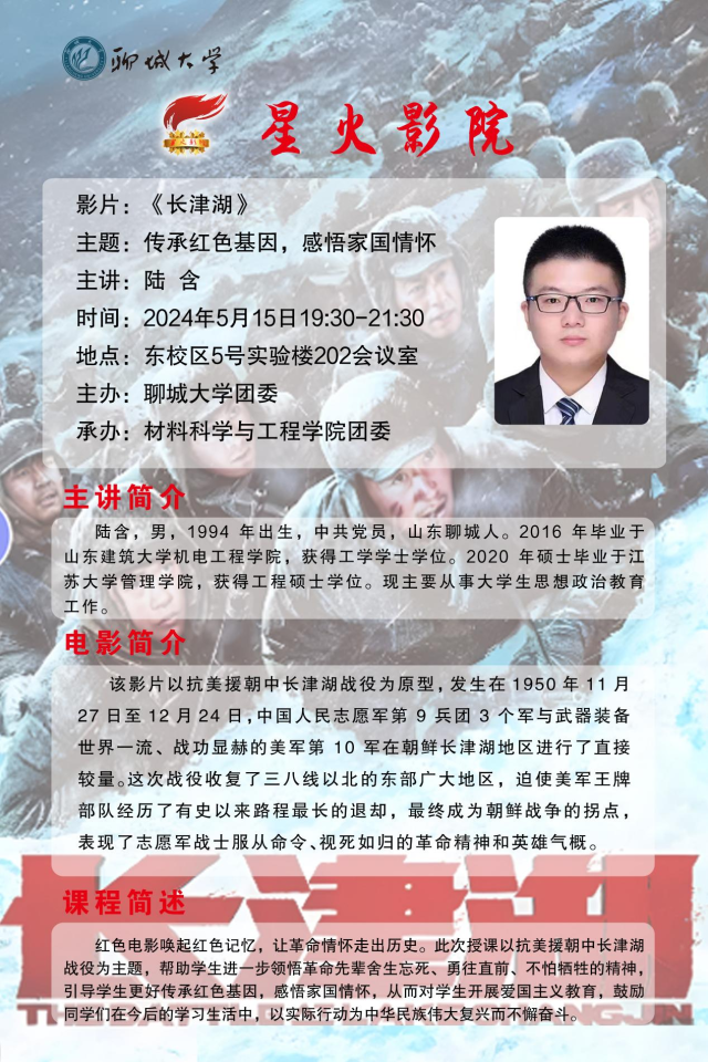 品味红色文化,感悟革命精神,传承爱国情怀,携手共创美好未来。2024年5月15日,bevictor韦德国际于东校区5号实验楼202会议室举办“星火影院”观影活动。本次观影影片为《长津湖》,特邀bevictor韦德国际团委辅导员陆含老师担任主讲嘉宾。