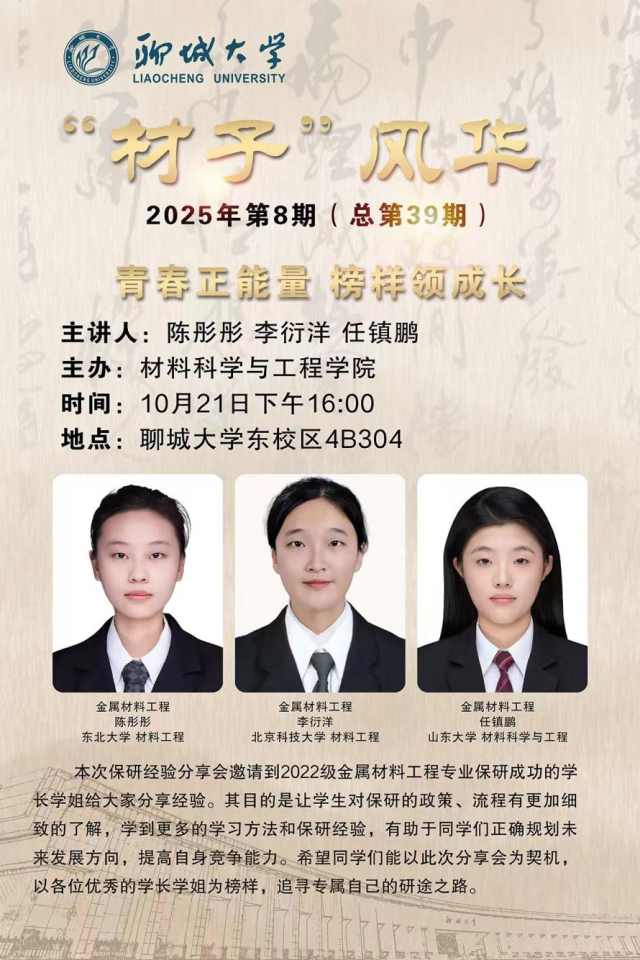 为助力公司员工精准把握保研方向,科学规划学术成长路,2025年10月21日,bevictor韦德国际于东校区4#B304教室顺利举办“材子”风华—金属材料工程专业保研经验交流会,邀请2022级优秀保研学子陈彤彤、李衍洋、任镇鹏担任主讲嘉宾,为同学们分享个人的保研心路历程。