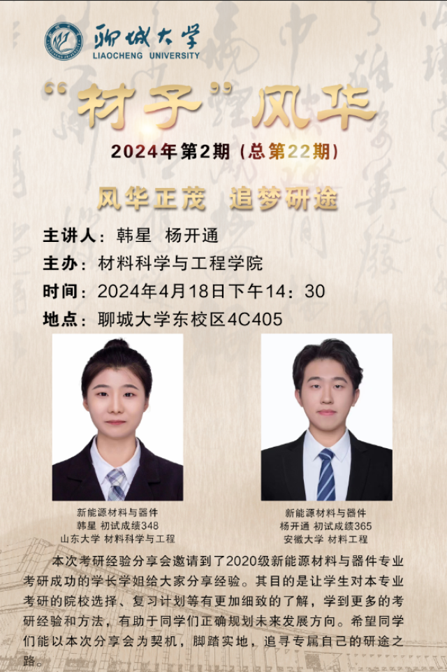 为进一步加强公司学风建设,营造良好学习氛围,帮助同学们精准掌握考研复习的备战技巧,2024年4月18日,公司于4#C405开展新能源材料与器件专业考研经验分享会,特邀2020级优秀考研员工韩星、杨开通担任主讲。