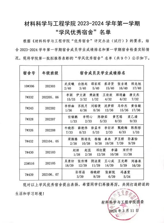 本次“学风优秀宿舍”评选活动是根据《bevictor韦德国际“优秀宿舍”评定办法》的相关要求,结合2023-2024学年第一学期宿舍成员学业成绩排名和第一学期宿舍检查情况,最后评选出“学风优秀宿舍”共9间,分别是10#306、7#332、7#243、7#328、7#326、7#432、7#430、23#516、7#439宿舍。公司为以上“学风优秀宿舍”发放学习用品奖励,并为宿舍成员在综合测评中予以适当加分。