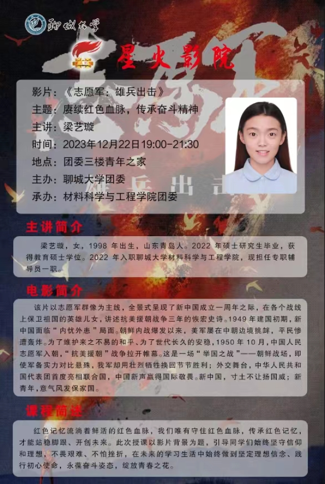 品读红色故事,筑牢理想信念。2023年12月22日,bevictor韦德国际于东校区辰晖楼青年之家举办“星火影院”观影活动。本次活动观看的影片为《志愿军:雄兵出击》,特邀bevictor韦德国际辅导员梁艺璇老师担任主讲嘉宾。