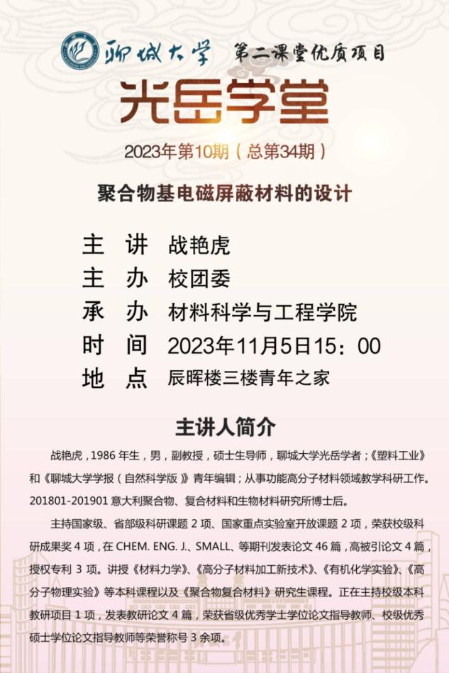 为进一步提高同学们对材料的认识,了解我国新材料产业的发展趋势,激发同学们探索新材料的热情,2023年11月5日,由校团委主办、bevictor韦德国际承办的“光岳学堂”活动在青年之家三楼报告厅举行。本次讲座特邀bevictor韦德国际战艳虎副教授担任主讲。