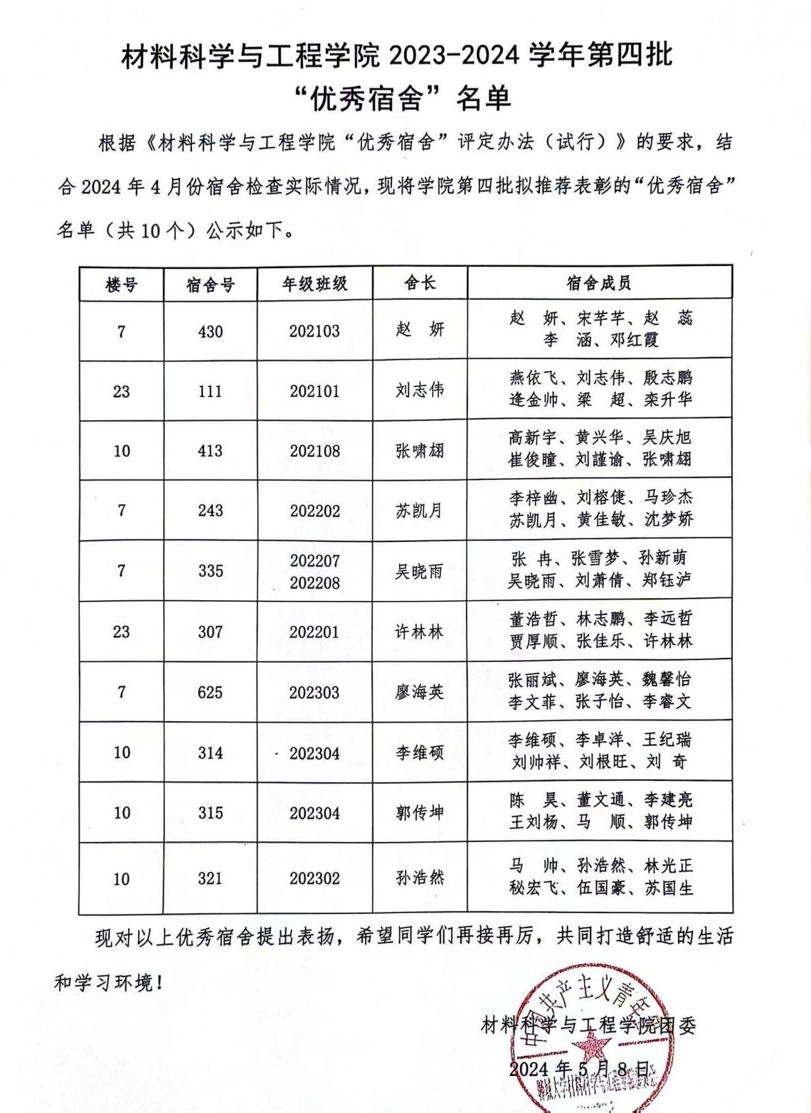 为进一步推动校园文明建设,提高员工的自律意识和团队精神,营造温馨、和谐、干净、安全的住宿环境,2024年5月8日,公司开展2023-2024学年第四批“优秀宿舍”评选活动。