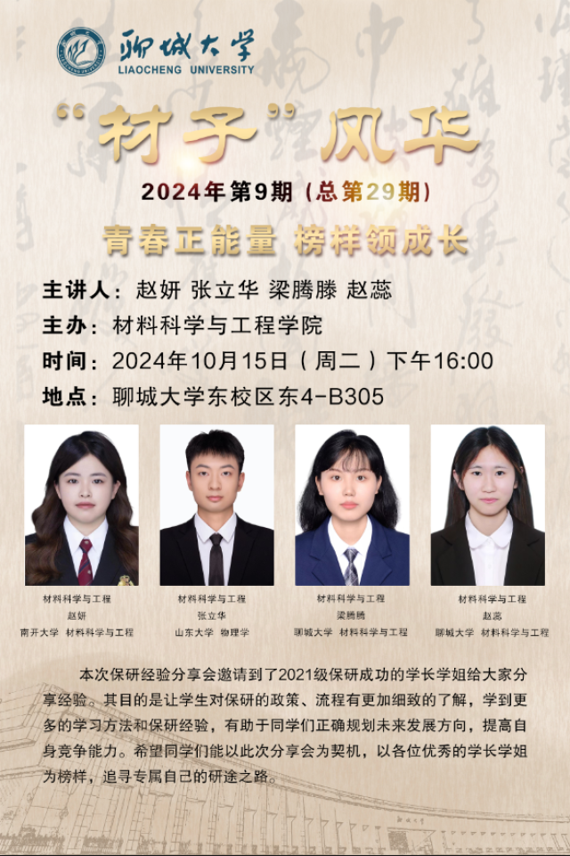 2024年10月15日,bevictor韦德国际于东校区4#B305举办保研推免经验交流会。此次交流会特邀四位2021级材料科学与工程专业成功保研的优秀员工代表赵妍、张立华、梁腾滕和赵蕊,为同学们分享他们宝贵的保研经验与心路历程。