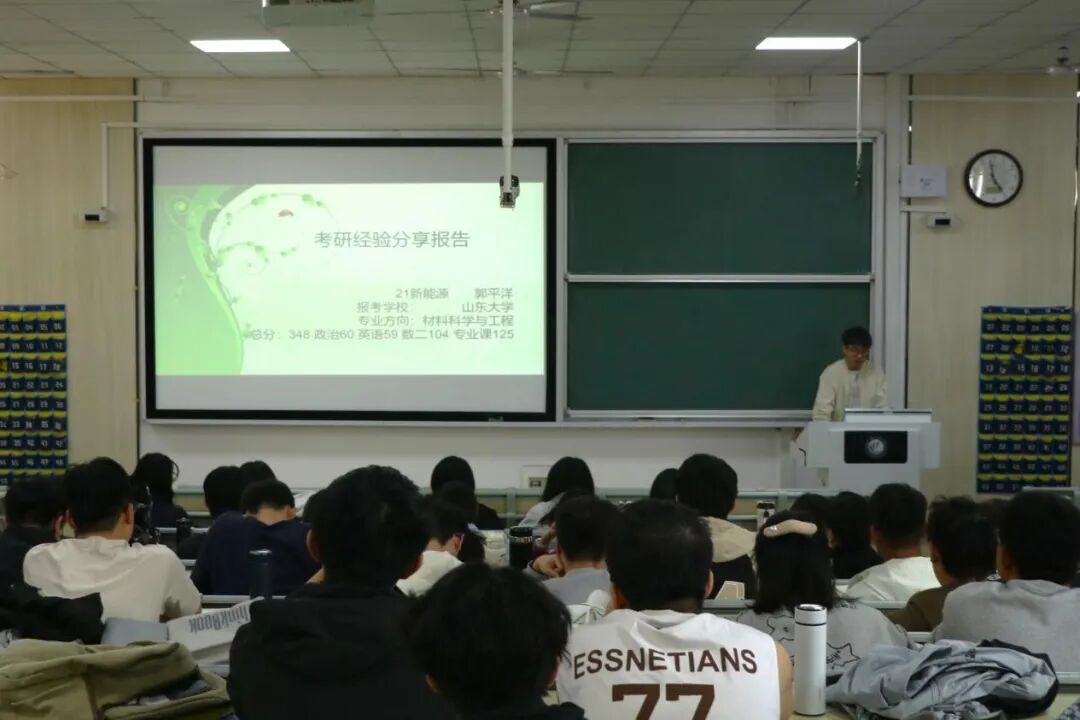 交流会上,赵丽杰同学结合自身考研经历,系统梳理了备考各环节的注意事项。同时,针对新能源材料与器件专业的学科特性,他着重剖析了专业核心课程的高效学习策略,深入阐释了目标院校选择的关键要素。通过生动详实地讲解有效调动了同学们的备考积极性,并鼓励同学们以持之以恒的意志品质来突破学习瓶颈,以科学有效的方法应对备考过程中的各类挑战。