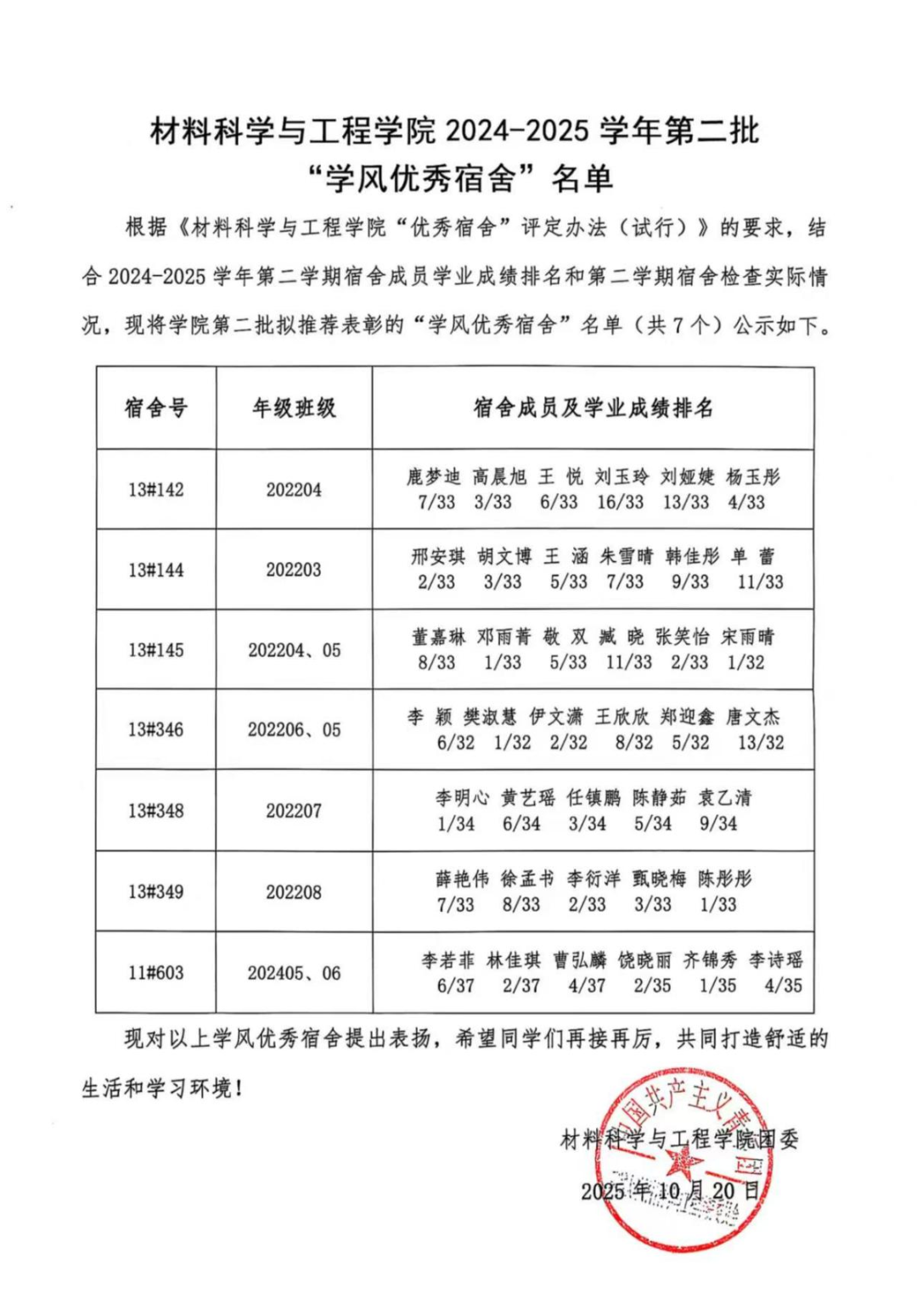 本次“学风优秀宿舍”评选活动是根据《bevictor韦德国际“学风优秀宿舍”评定办法(试行)》的要求,结合2024-2025学年第二学期的宿舍检查实际情况及第二学期宿舍学业成绩排名,现将公司第二批拟推荐表彰的“学风优秀宿舍”名单(共7个)公示如下:13#142、13#144、13#145、13#346、13#348、13#349、11#603宿舍。公司为以上“学风优秀宿舍”发放学习用品奖励,并为宿舍成员在综合测评中予以适当加分。