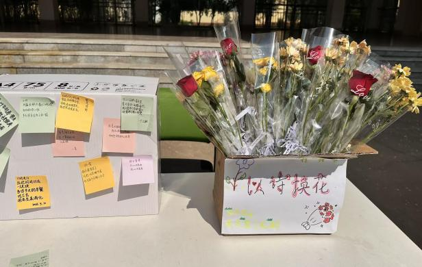 活动当天,参与者首先在入口处签到并领取便利贴,围绕“5·25”主题创作三行诗。同学们或抒发对生活的感悟,或表达对友情的珍视,短短三行文字中充满了真挚的情感。创作完成后,大家进入交流场地自由走动,相互分享创作心得,现场氛围轻松而温馨。在自由交流环节结束后,同学们围坐在一起,工作人员随机邀请参与者上台分享创作灵感。通过这一环节,同学们不仅展示了才华,更增进了彼此的理解与共鸣。最后,大家用自己创作的三行诗换取鲜花,为活动画上了圆满的句号。