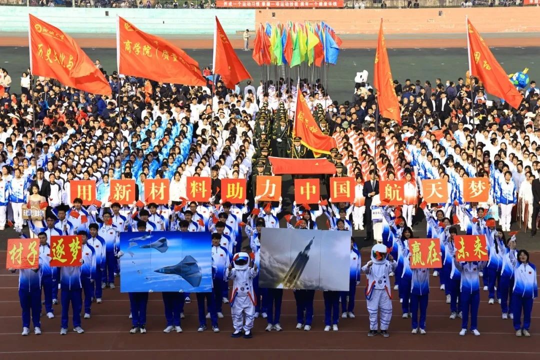 “材子逐梦,赢在未来。用新材料助力中国航天梦。”公司师生身着统一服装,手中挥舞着国旗,高喊着口号,迈着坚定的步伐走向主席台,他们团结一致,展现着公司的精神风貌。相信在新时期新时代,材料公司全体师生将齐心协力,紧跟时代发展步伐,为国家新能源新材料高速发展不断添砖加瓦。