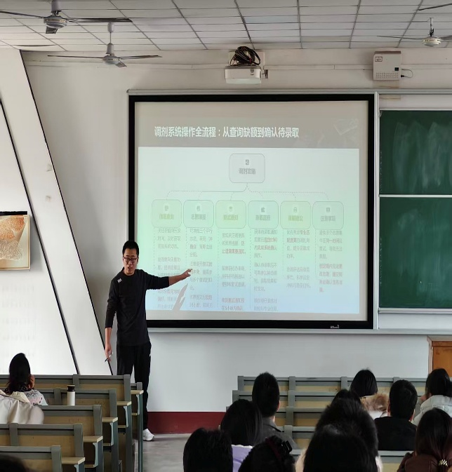 互动环节中,同学们积极提问,老师们耐心解答,现场交流氛围浓厚。最后,孙静雯学姐结合自身复试与调剂经历,分享了她如何通过调剂系统精准匹配院校、准备调剂材料以及跟进录取进程的实践经验。她的分享内容详实、贴近实际,使在场员工对调剂操作有了更直观深入的理解。